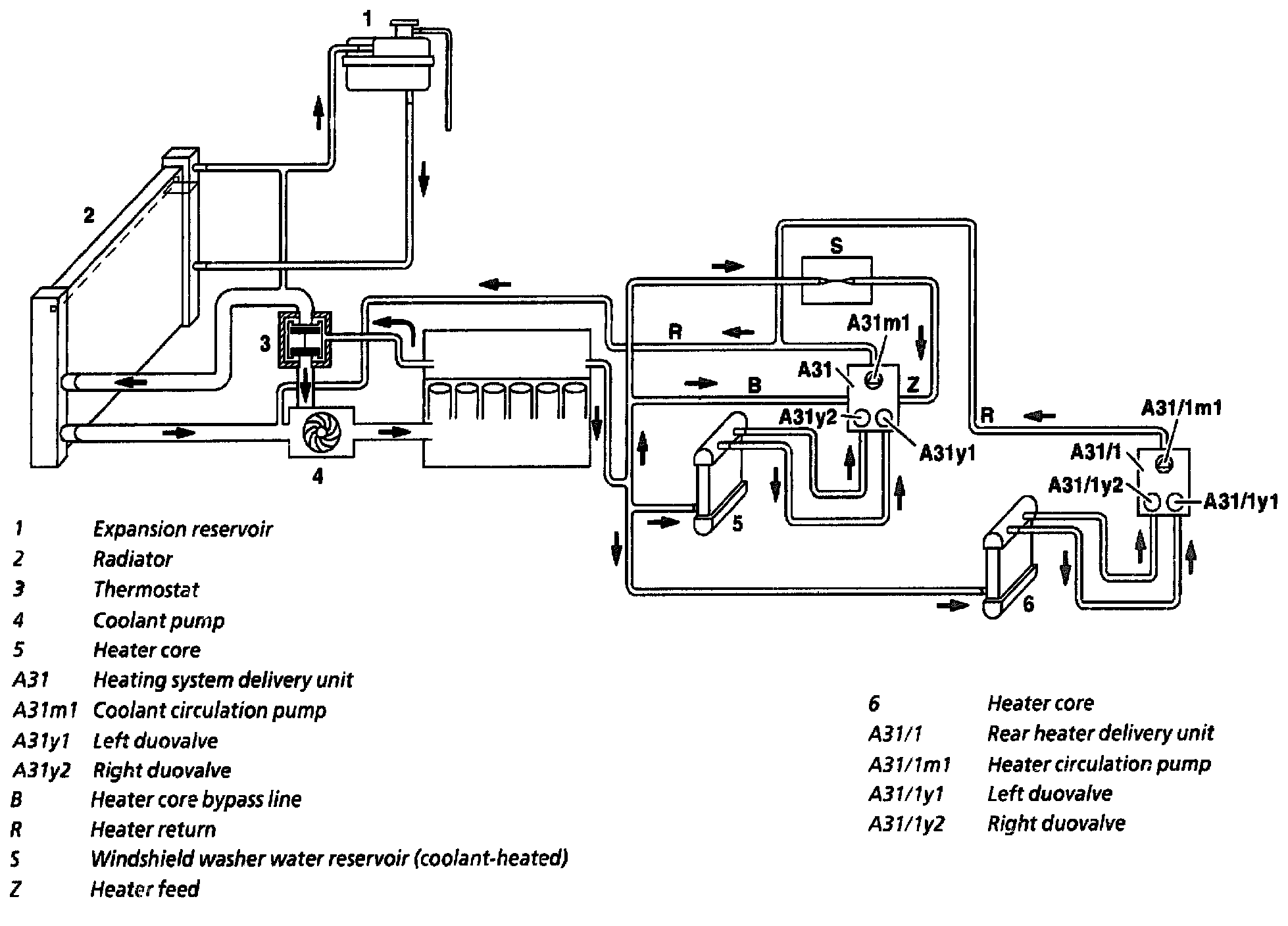 The coolant pump (4) pumps cold coolant through the engine. There the coolant absorbs heat from the engine and is heated up. Then the heated coolant flows through the heater core (5) where the heat is transferred to the interior air. The quantity of coolant flowing through the heater core (5) is controlled by the duovalves (A31y1 and A31y2) located in the heater return (R). The quantity of coolant can be regulated separately for the left and right side. The coolant travels through the heater return (R) back to the coolant pump (4). The major portion of the coolant flows from the engine to the thermostat (3) and not through the heater. Depending on the water temperature, the thermostat allows the water to flow to the radiator (2) or directly on to the coolant pump (4).
