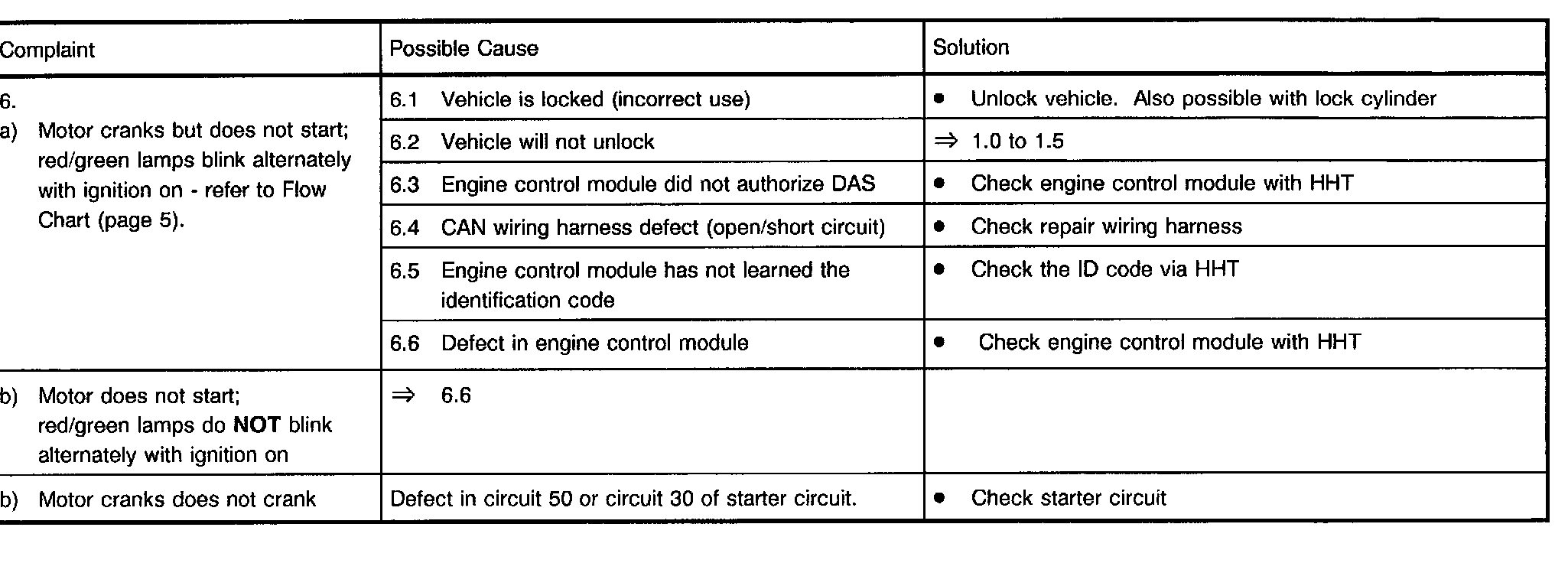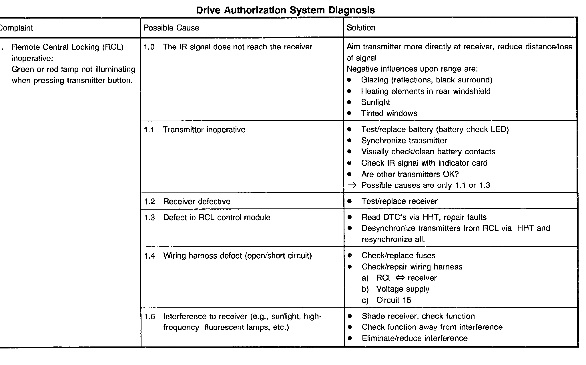 As of Model Year 1996, all models (excluding models mentioned, under subject A) are equipped with the Drive Authorization System (DAS). This system increases the theft resistance of the vehicle by disabling fuel injection if the vehicle is not properly unlocked, either via the IRCL system or with the key. This system uses the CAN Bus to transfer data from the IRCL control module to the engine control module during each starting attempt.Operational Description - DAS