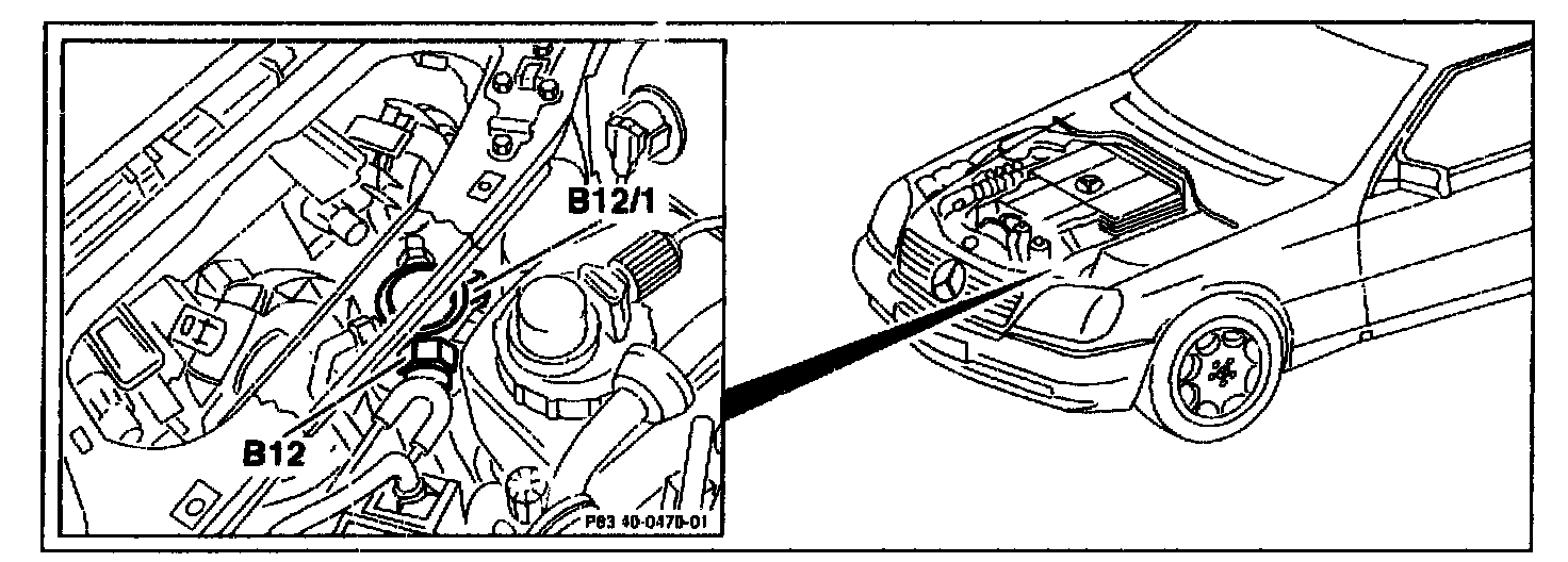 The refrigerant pressure sensor (B12) is located on the receiver/drier at the front left in the engine compartment.