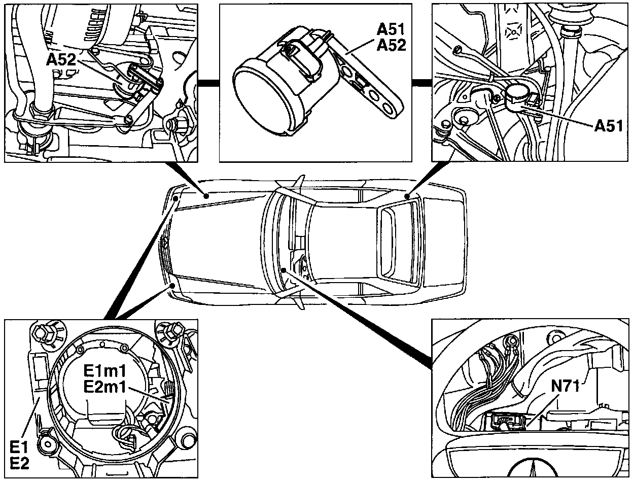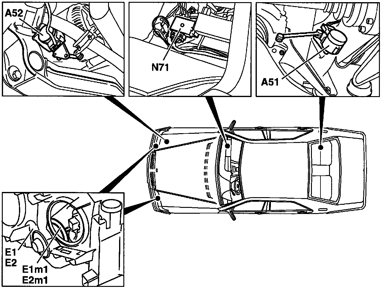 NOTE - Model 129: When equipped with ADS the front axle and rear axle level sensors (B22/2, B22/3) perform the same function as the front and rear axle sensors (A52 and A51).