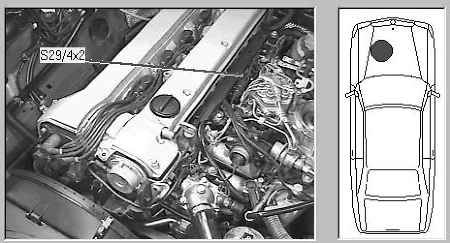 Engine compartment, center left front of engine