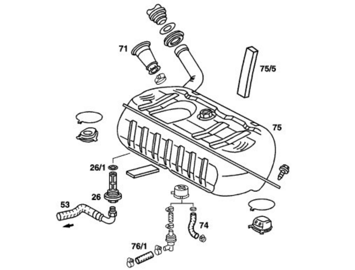 The fuel is drawn through the fuel strainer (26) and the fuel inlet hose (53). The fuel flows back along the return flow hose (74). The vent hose (76/1) runs to the activated charcoal canister.
