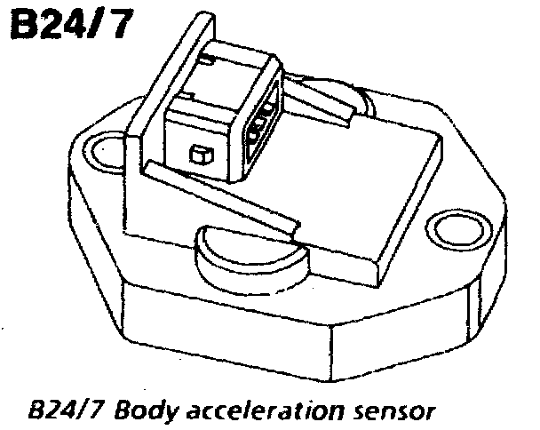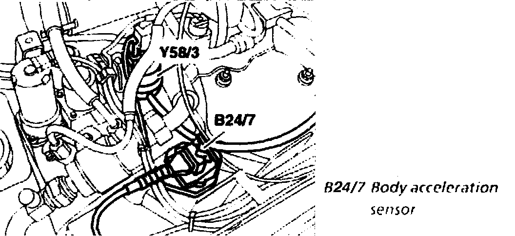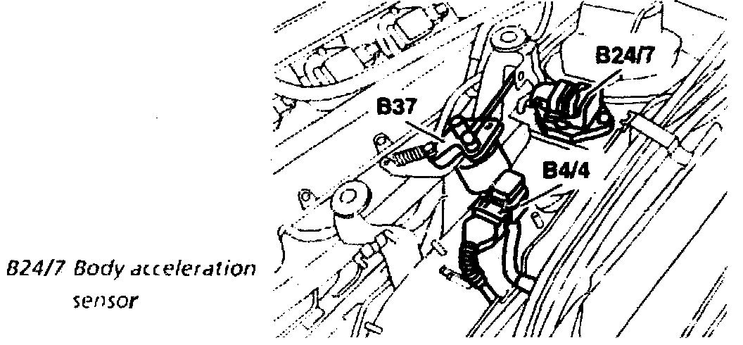The body acceleration sensor (B27/4) consists of an electronic vibration module (operating on the spring mass system principle). It detects the vertical body accelerations at the front wheelhouse and module.