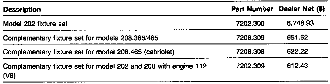 A Celette fixture set, used for collision repair, is available for model 202 (Figure 1). This set is available through the Mercedes-Benz Standard Service Equipment Program, order number 7202.300.