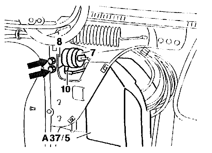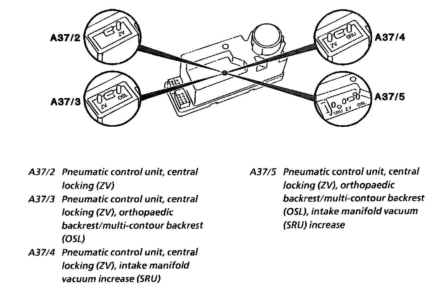 The pneumatic lines to the tank flap actuator and trunk lid actuator run directly to the actuators from the distributor plug on the pneumatic control unit (A37/2 - A37/5).