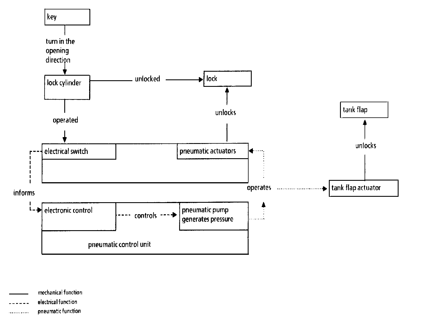 The pneumatic system equipment (A37) starts up and generates excess pressure which is led to all the pneumatic actuators via a system of lines. The diaphragms in the actuators are pressed up, operate the locks via linkages and unlock them. The tank flap actuator unlocks the flap directly.