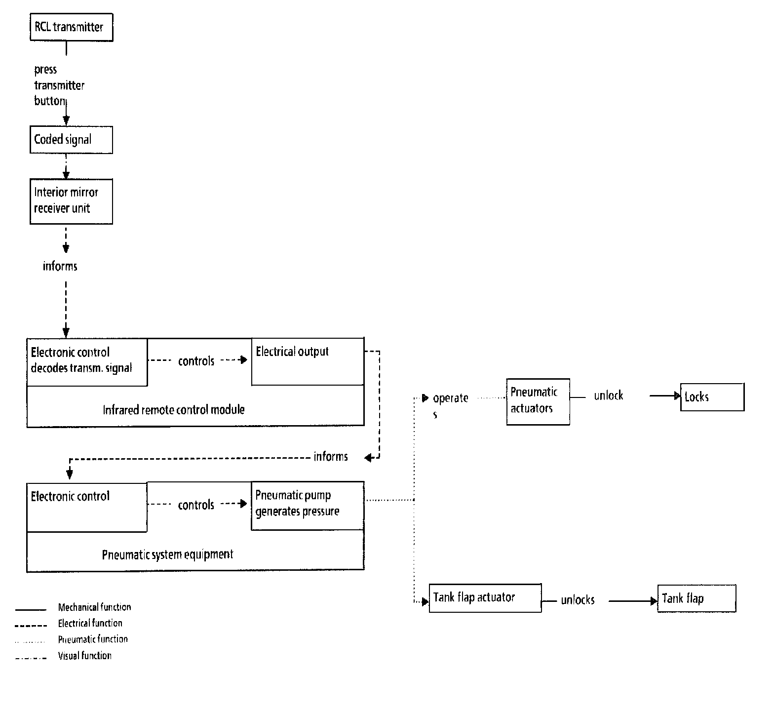 The locking process proceeds in a similar way to the unlocking process. However the pneumatic system equipment (A37) is actuated to ground by the next actuation of the transmitter button via the second control line of the infrared remote control module. The direction of rotation of the pump motor is reversed, generating the vacuum required for locking.