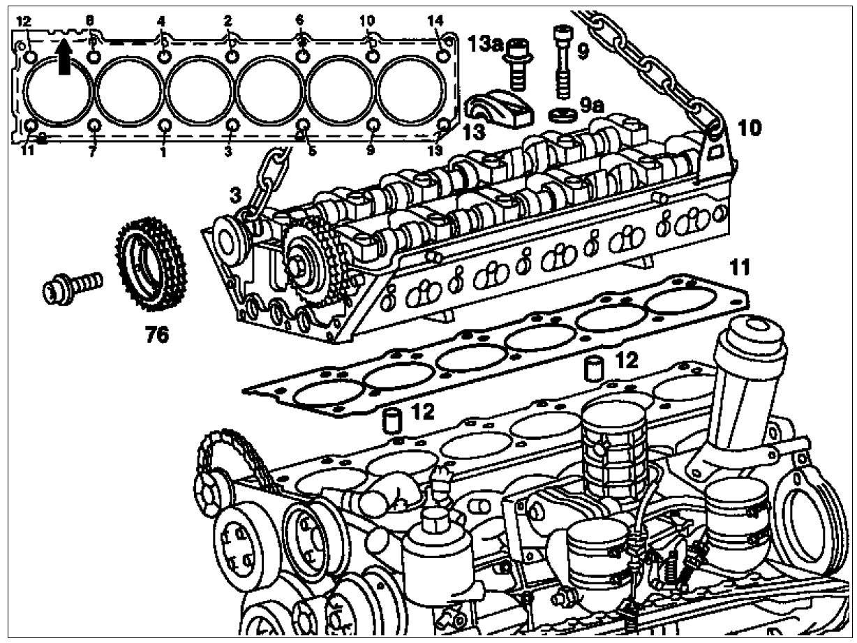 - Slacken when engine is cold with tool No. 617 589 00 10 00, or equivalent, in stages in reverse order of tightening diagram shown in the illustration above, beginning with bolt 14.