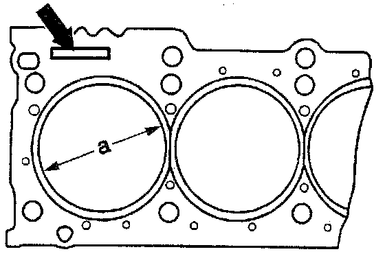 NOTE: Diameter (a) of the C36 head gasket has been increased to 92.1 mm and a part number (arrow) will be stamped into the gasket in the area below the notches.
