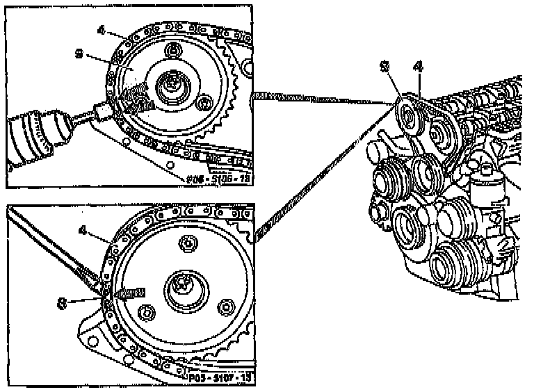 6. Pry off plate (8) of timing chain (4) with screwdriver.