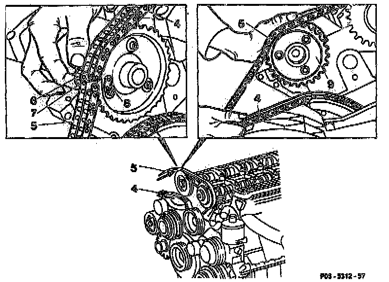 NOTE: Riveted links of the IWIS version chain should be matched to the IWIS timing chain and riveted links of the Renold version chain should be matched to the Renold timing chain. The identifications are stamped in each case on the outer plates of the timing chain.
