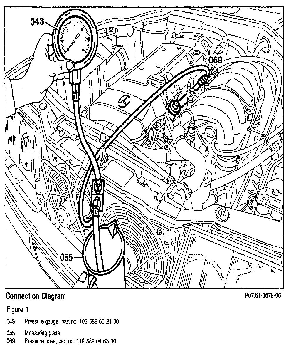 4. After completing test, using measurement glass (055), release fuel pressure and allow residual fuel to drain into glass (see Figure 1 below.)