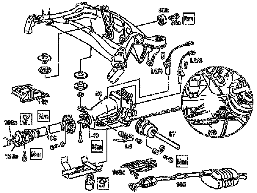 - Self-locking nut, rear axle center assembly at front to rear axle carrier: 50 Nm