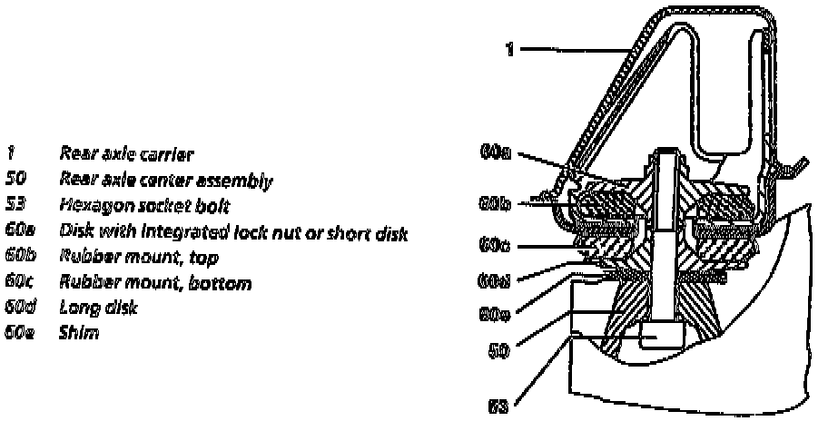- Depending on the version, 1-2 shims (60e) can be installed on the rear axle center assembly