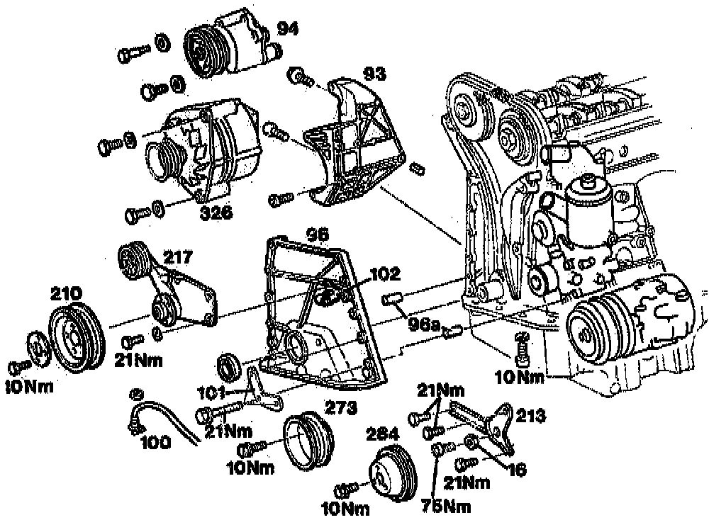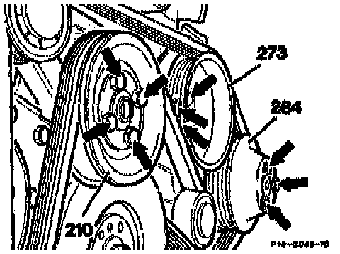 8. Unscrew bolts (arrows). take off belt pulleys of fan clutch (210), coolant pump (273) and power steering pump (284).