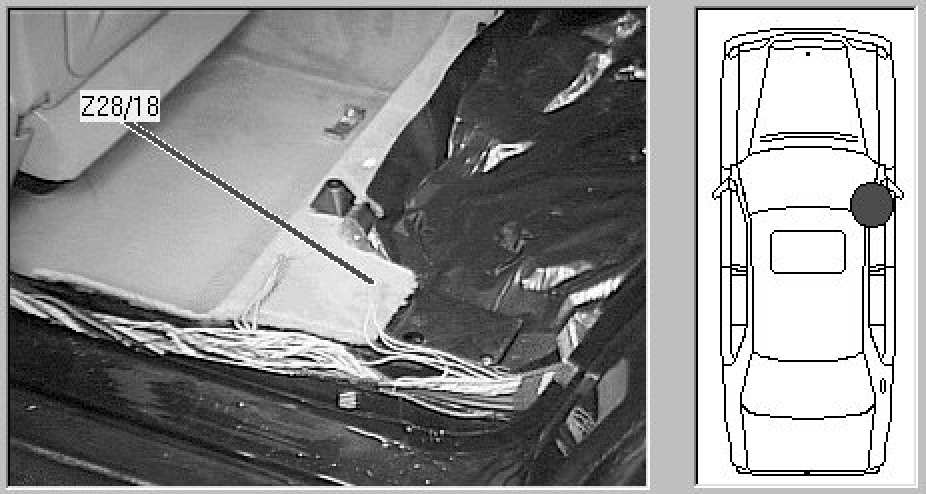 Passenger compartment, in wiring tray at left rear door sill.