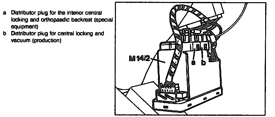 The supply line for the interior central locking leads from a distributor plug on the supply pump direct to a distributor with 8 connections in the rear.