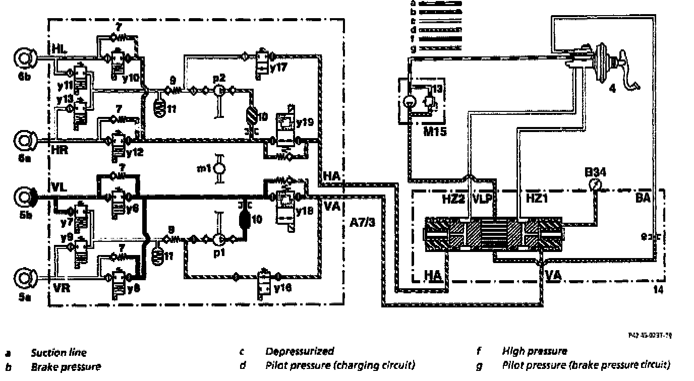 The brake fluid returned at the same time by the high-pressure/return pump (p1) is also fed back into the charging pressure circuit of the front axle though the pressure limiting valve (170 bar) integrated in the switchover solenoid valve (y18).