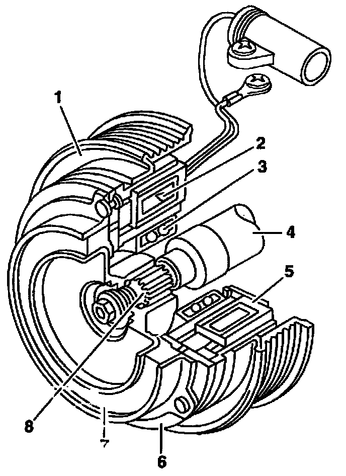 The pulley (1) on the A/C compressor drive shaft (4) is driven by a poly-V-belt. It turns on the ball bearing (3) around the magnetic coil (5) fastened to the A/C compressor housing. The pressure plate (6) with rubber insert (7) is connected to the A/C compressor drive shaft (4) by splines (8) allowing it to move in the axial direction.