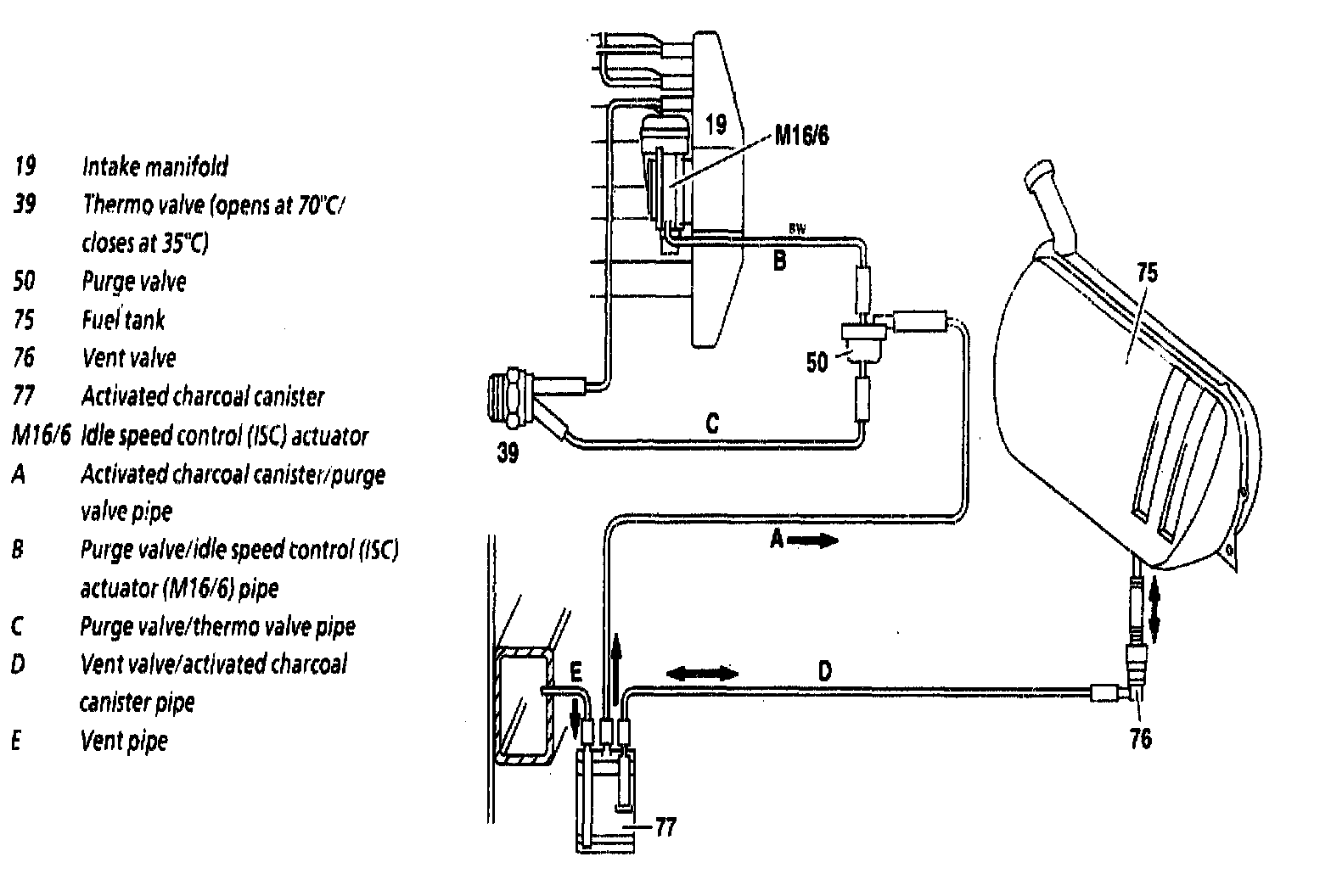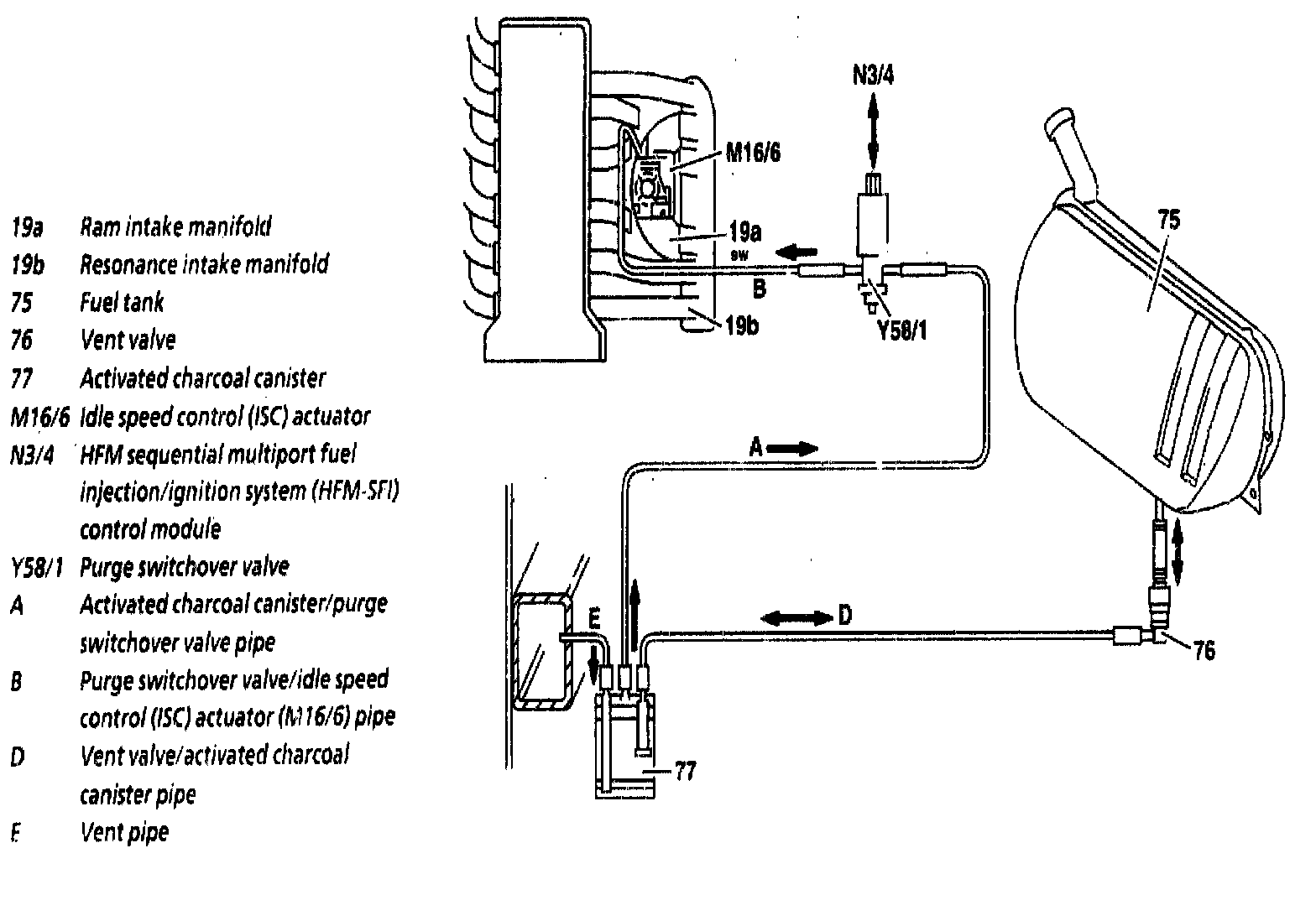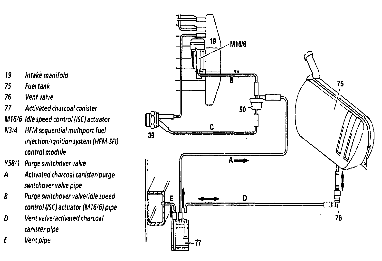 Connecting diagram of evaporation emission control system HFM-SFI models 124, 129, 140 without ski bag with engine 104