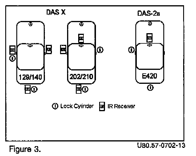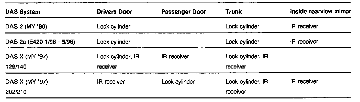 In models 129 and 140, the lock arrangement has not changed with DAS X: Both the driver's door and the trunk have fully4unctional lock cylinders. However, the IR sensor in the interior rearview mirror is deleted, and replaced by three exterior IR sensors, one located in each front door and one at the trunk. This is similar to the arrangement in MY '95 vehicles.
