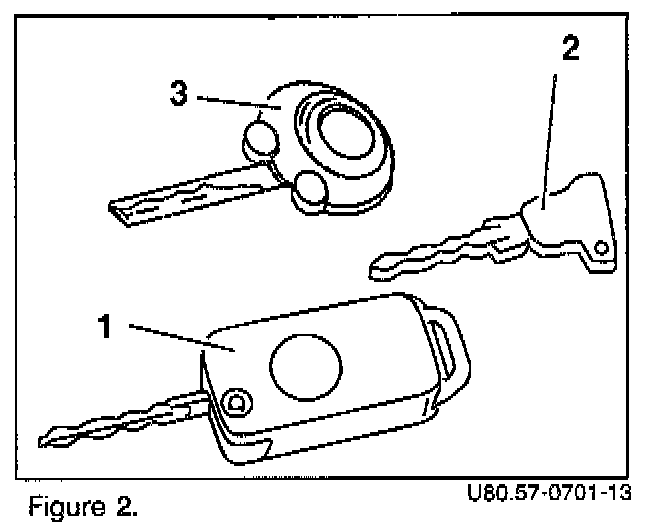 It is not possible to have two keys with the same key "number" - one will be automatically disabled by the control module. Supplied with the vehicle are two IR transmitter keys (1, Figure 2), one flat (mechanical) key (2, Figure 2) and one round-head valet key (mechanical key) (3, Figure 2). A mechanical master key is not available as a spare part, although the flat key has all the functions of a mechanical master key, without the large square head.
