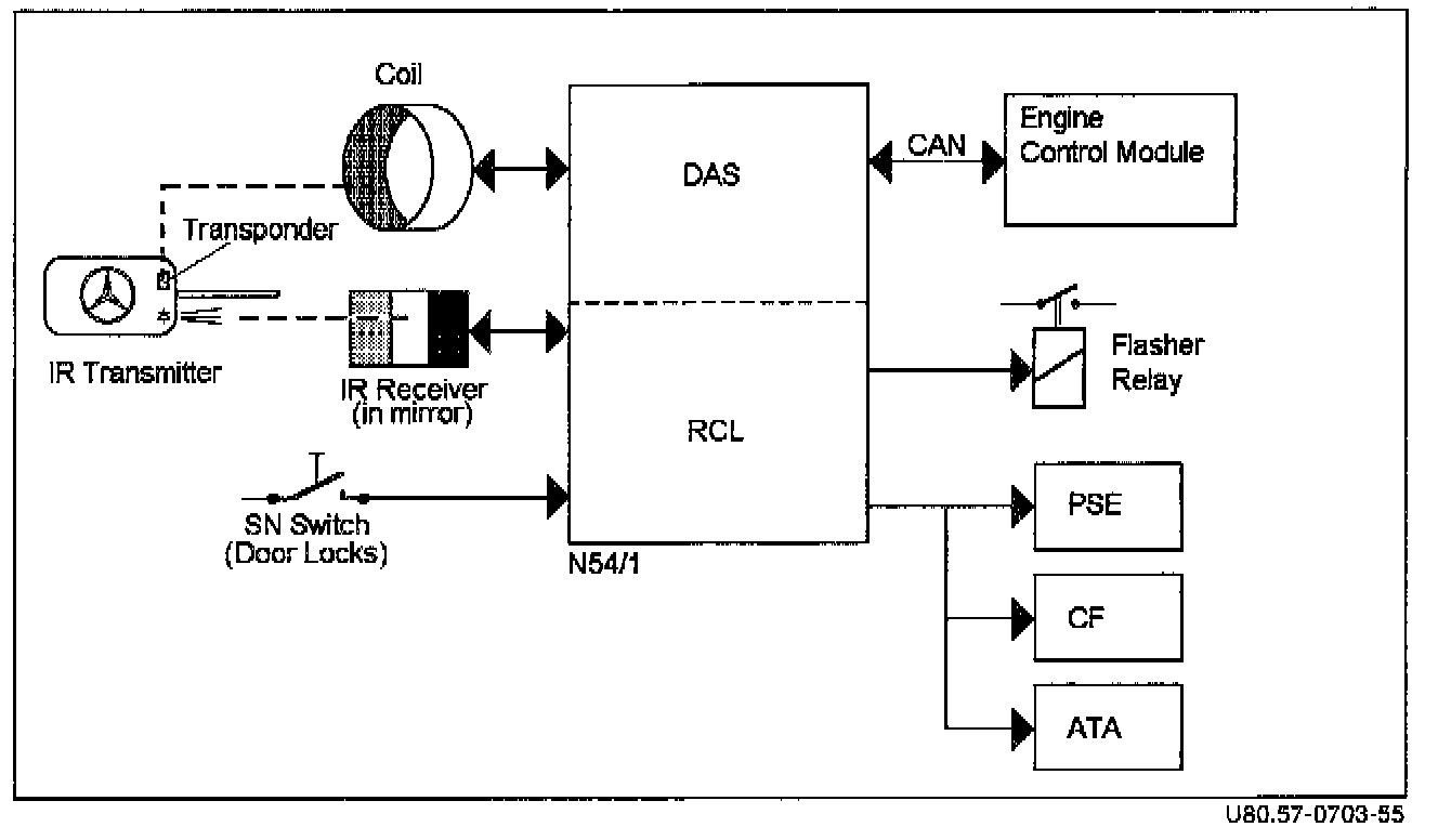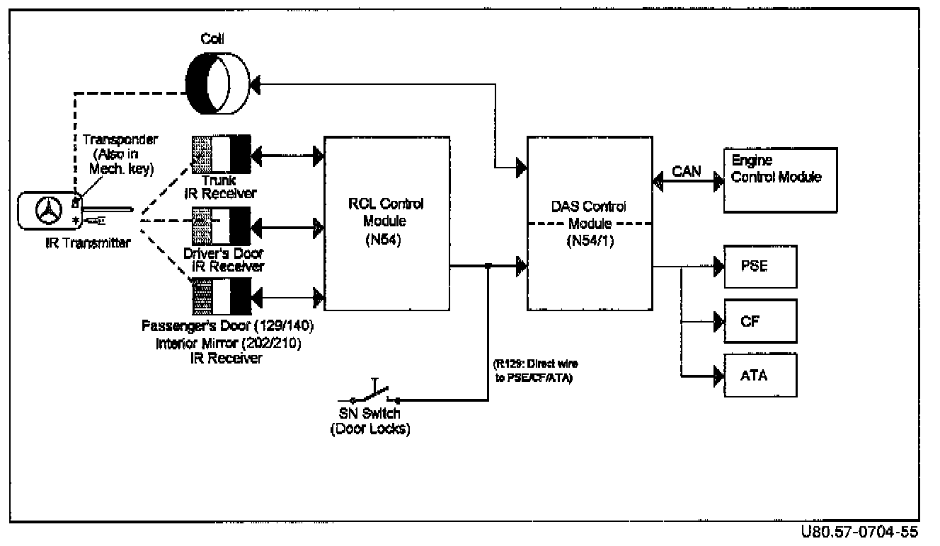 In the brief time period between the start of E420 (model 210.027) production (01/96) and the beginning of main series production for Model Year 1997 (06/96), an interim system, known as DAS-2a, is installed in E420 vehicles. This system is identified by the presence of a transponder ring (L11, Figure 1) around the ignition lock and the absence of exterior IR receivers
