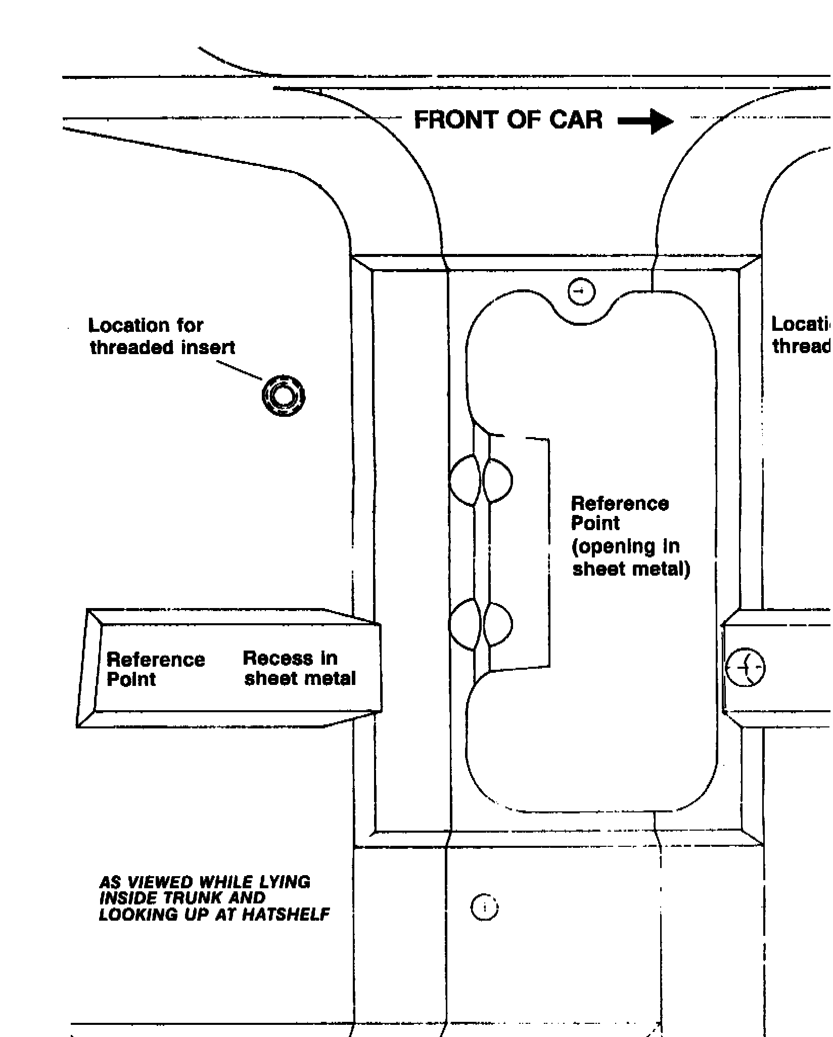 3. Place template (from installation kit) in position in right forward corner of trunk under hatshelf. Align the reference points. Punch four hole locations according to template (location for threaded inserts).