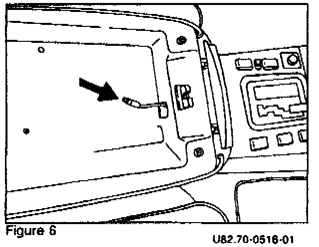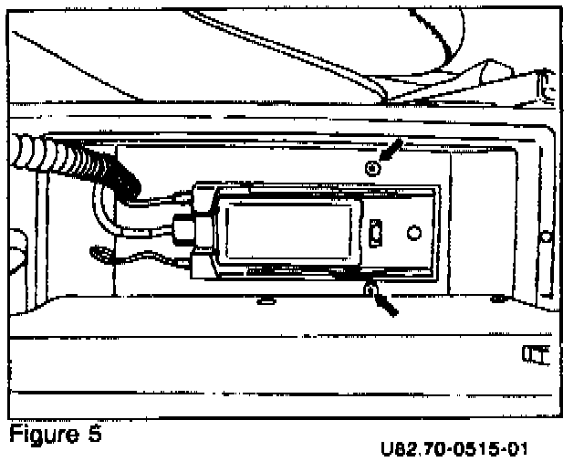 11. Replace carpeting and charger-holder into center console compartment, routing the harness along right side of compartment. Secure carpeting with two screws (arrows, Figure 5) to angle bracket in compartment.