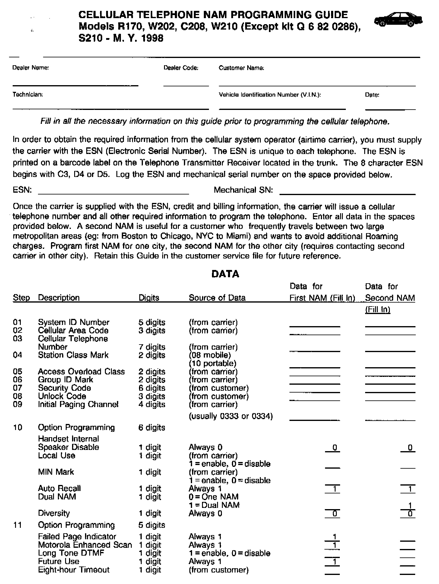 Models R170, W202, C208, W210 (Except kit number Q 6 82 0286), S210 Model Year 1998