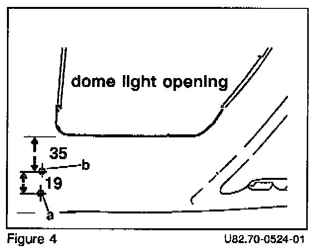 4. Enlarge forward hole (a, Figure 4) to 8 mm so that the microphone connector can pass through. Pass microphone connector and cable through enlarged opening. Secure microphone base to headliner with 3 x 10 screw. Fasten back of screw with with speed nut. Pull microphone cable completely through opening. Place 2 fingers over microphone mounting base from above the headliner. Snap, microphone onto base evenly. Do not latch one side first.