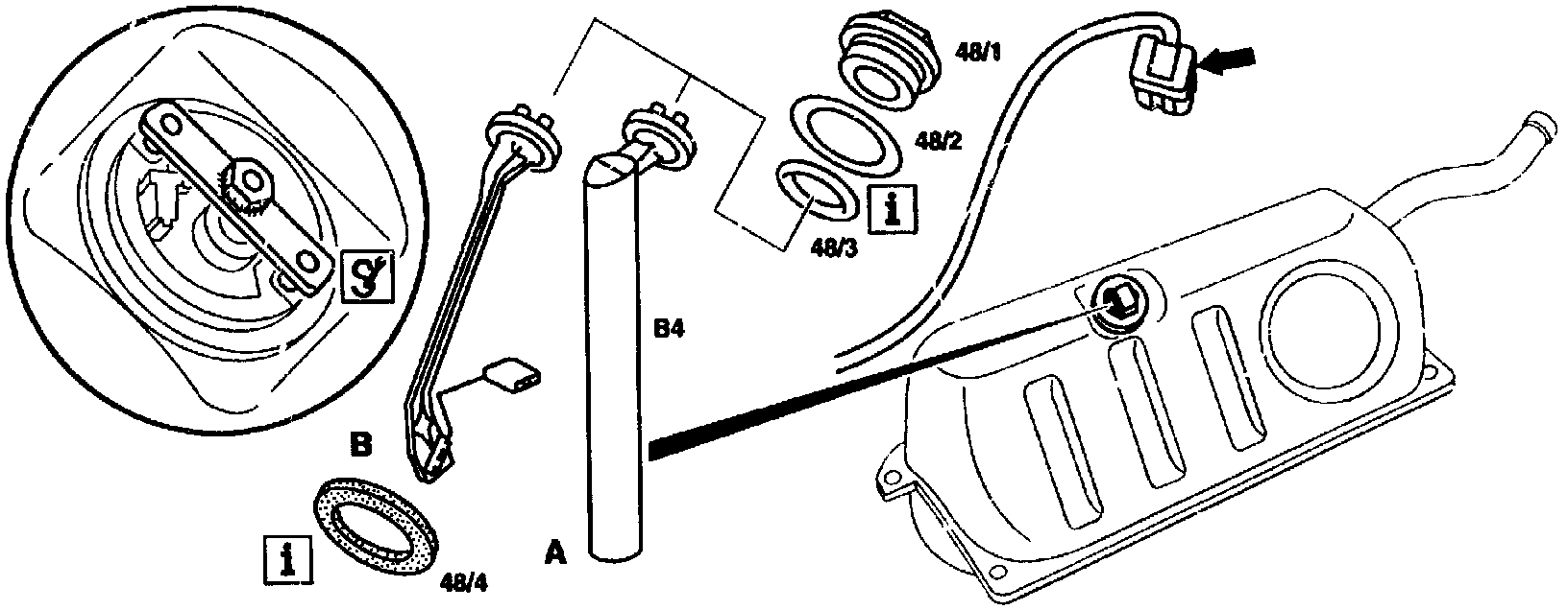 3. Unbolt sealing flange (48/1) and fuel gauge sender (B4).