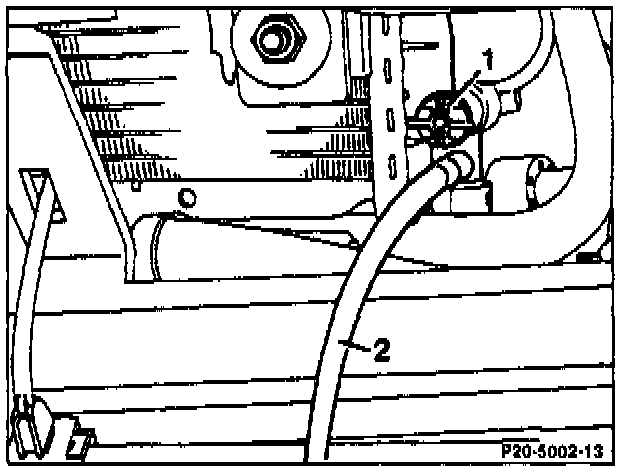 - Drain coolant at radiator by fitting a hose (inner diameter 12 mm) onto the connection (arrow) and unbolting drain plug.