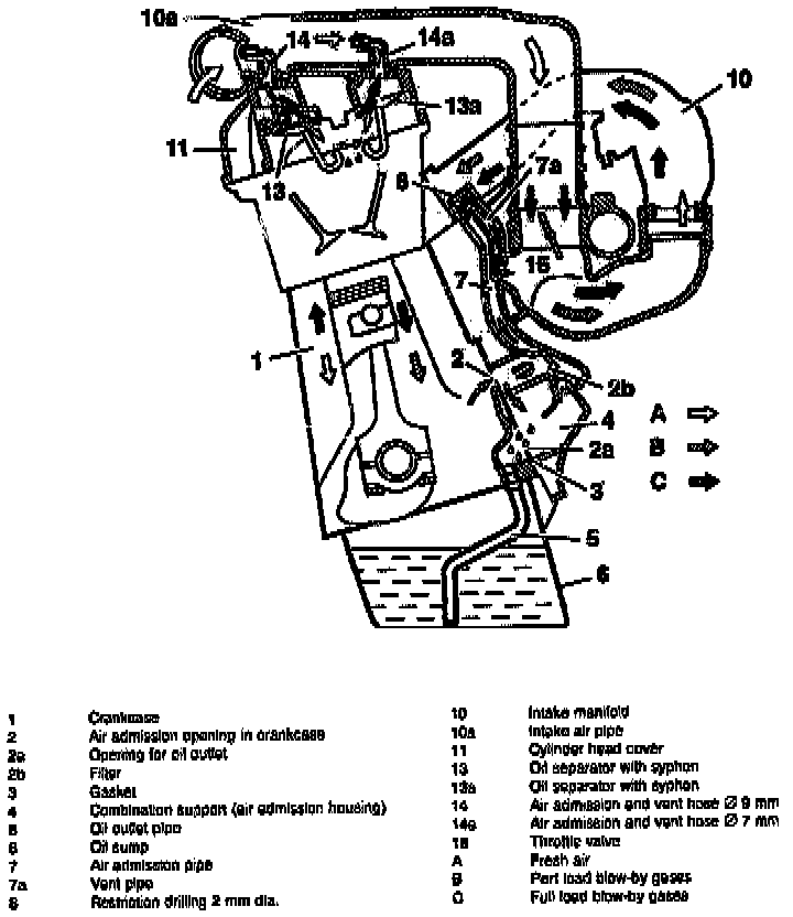 The crankcase (1) is vented in part load via the combination support (4) of the vent (2b) of the vent pipe (7) through a 2 mm dia. restriction drilling (8) in the manifold of the vent pipe (7a) to me intake manifold (10).
