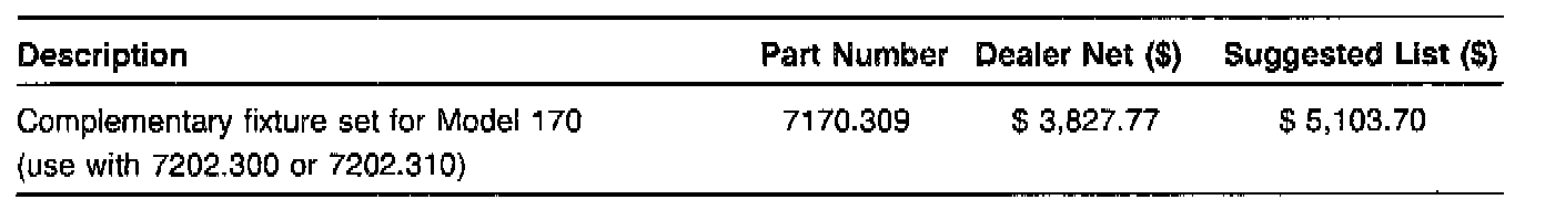 This dedicated fixture set is a complementary set to the model 202 fixture set, part number 7202.300 or 7202.310 Either set is necessary to use the model 170 complementary set.