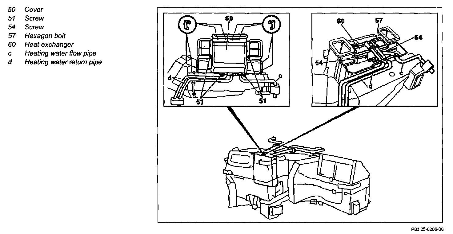 9 Detach heating water pipes (c, d) on heat exchanger, remove screws (57)