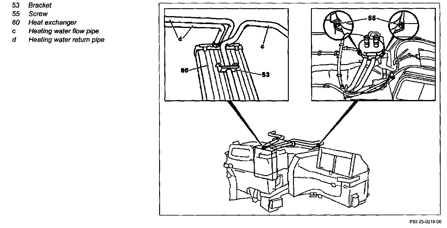 6 Remove heating water return line (d), (screws 55)