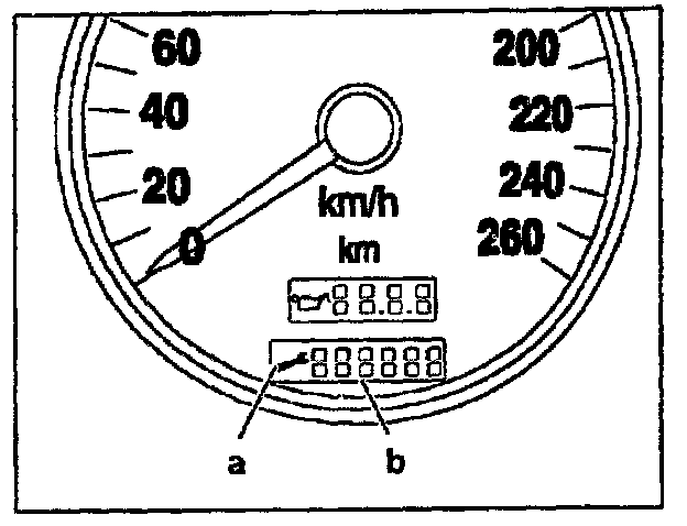 The maintenance indicator shows the driver when maintenance service is due. The maintenance indicator operates according to a distance traveled and time criterion. After exceeding a total distance or total time set at the factory, the maintenance indicator becomes active: The tool symbol (a) comes on and the maintenance information (b) is displayed instead of the total mileage.