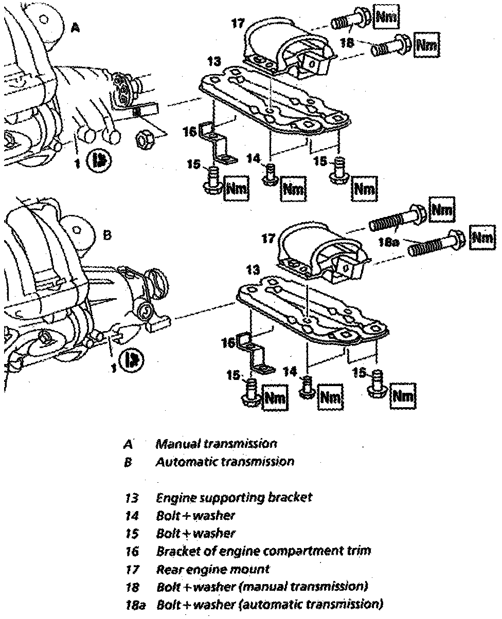 Bolt and nut of rear engine mount to transmission: 40 Nm