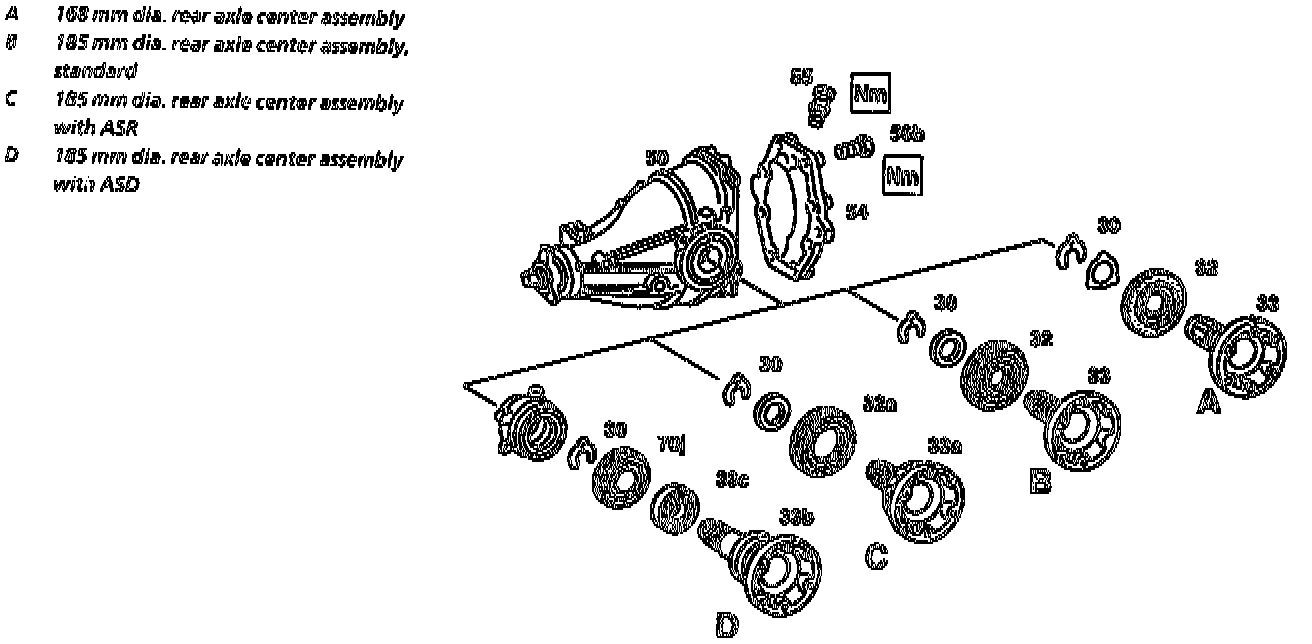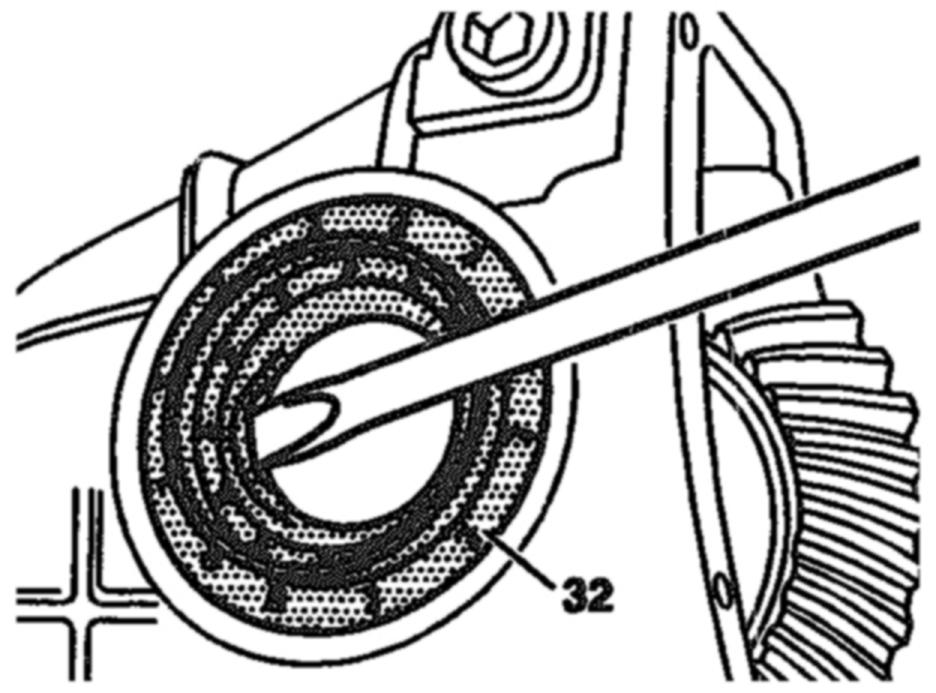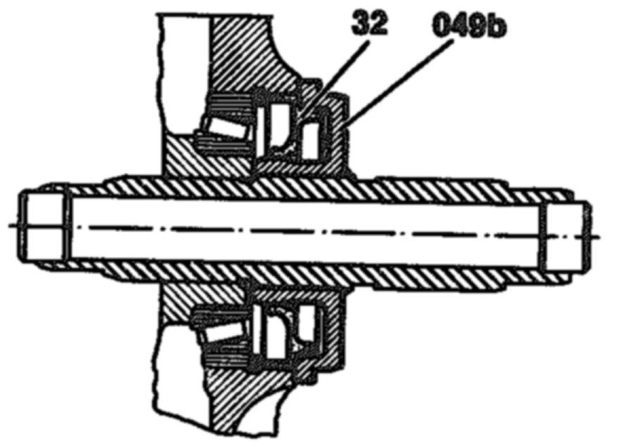 - Coat the outside diameter and sealing lip of radial seal ring (32 or 32a) with hypoid or universal hypoid transmission fluid, then press into case using assembly mandrel tool No. 126 589 00 15 00 (049b), or equivalent