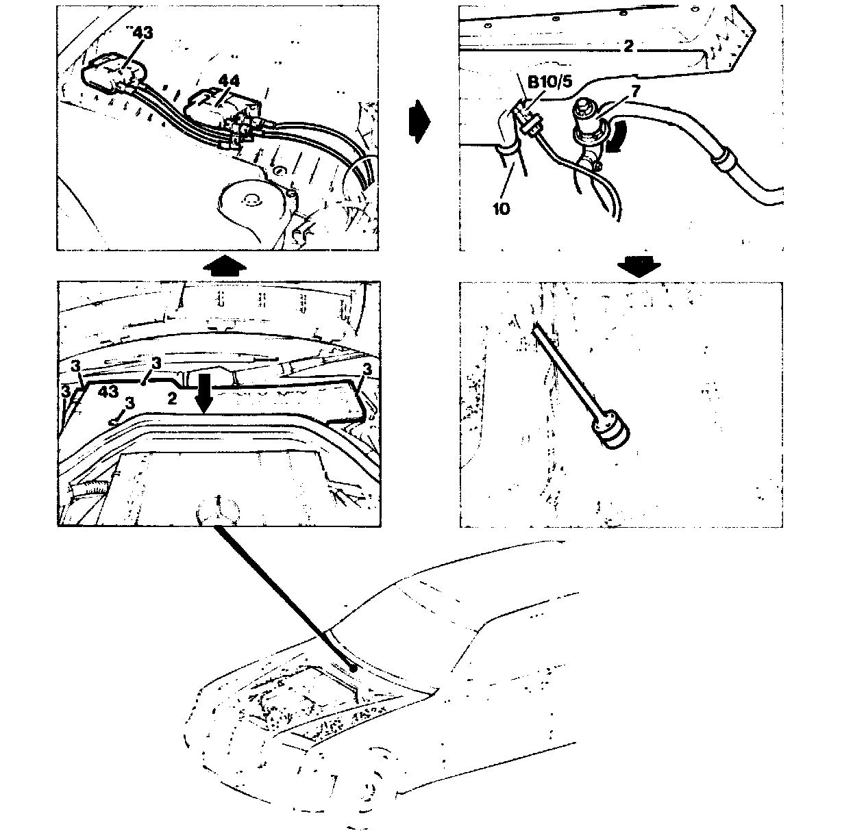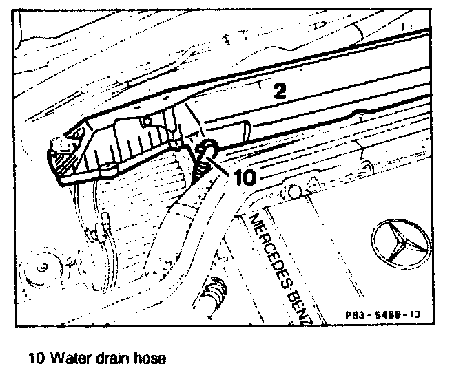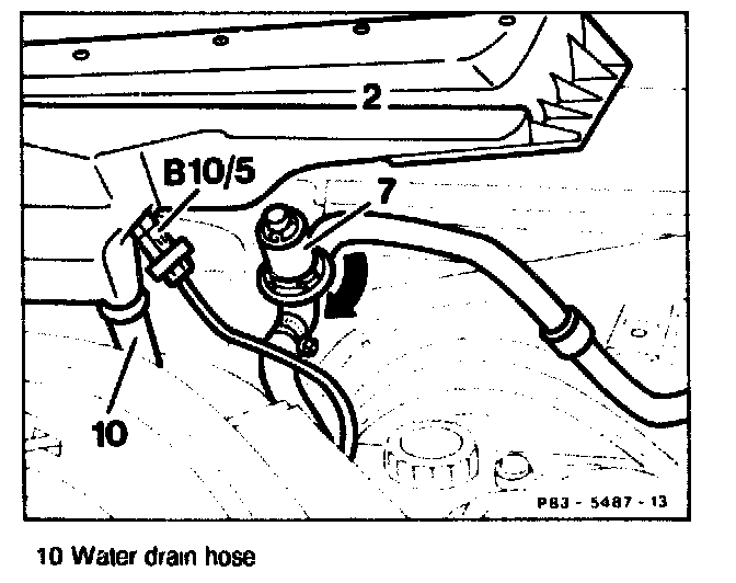 Lift air collector unit (2), turn thermal valve for surface heating of wiper system (7) to the left, unclip and pull out temperature sensor (B10/5). (On vehicles with automatic climate control)