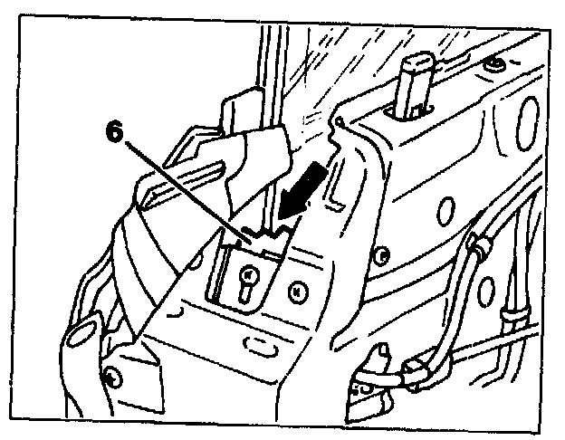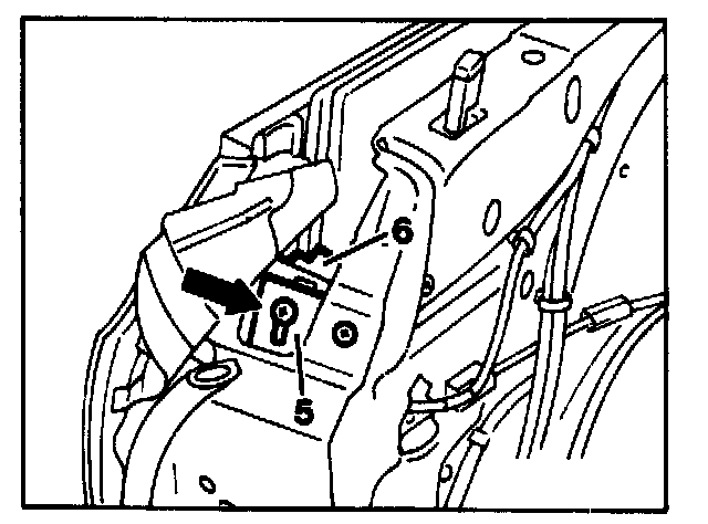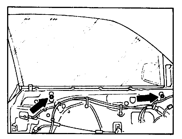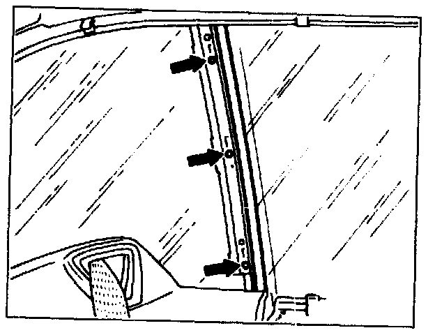 press from outside forward and up into sealing frame, then tighten screws on rear window lift arm through top assembly hole (arrow) without opening front door.