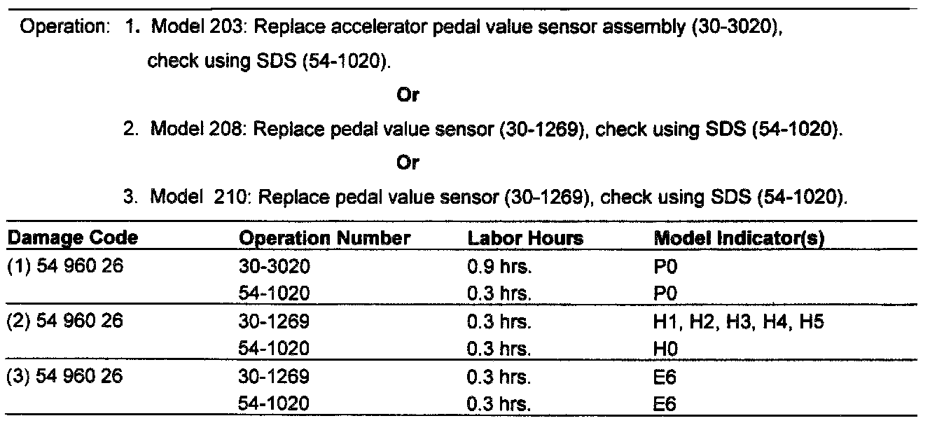 The affected pedal value sensor assemblies (for models 208 and 210) are identified via a five digit code: