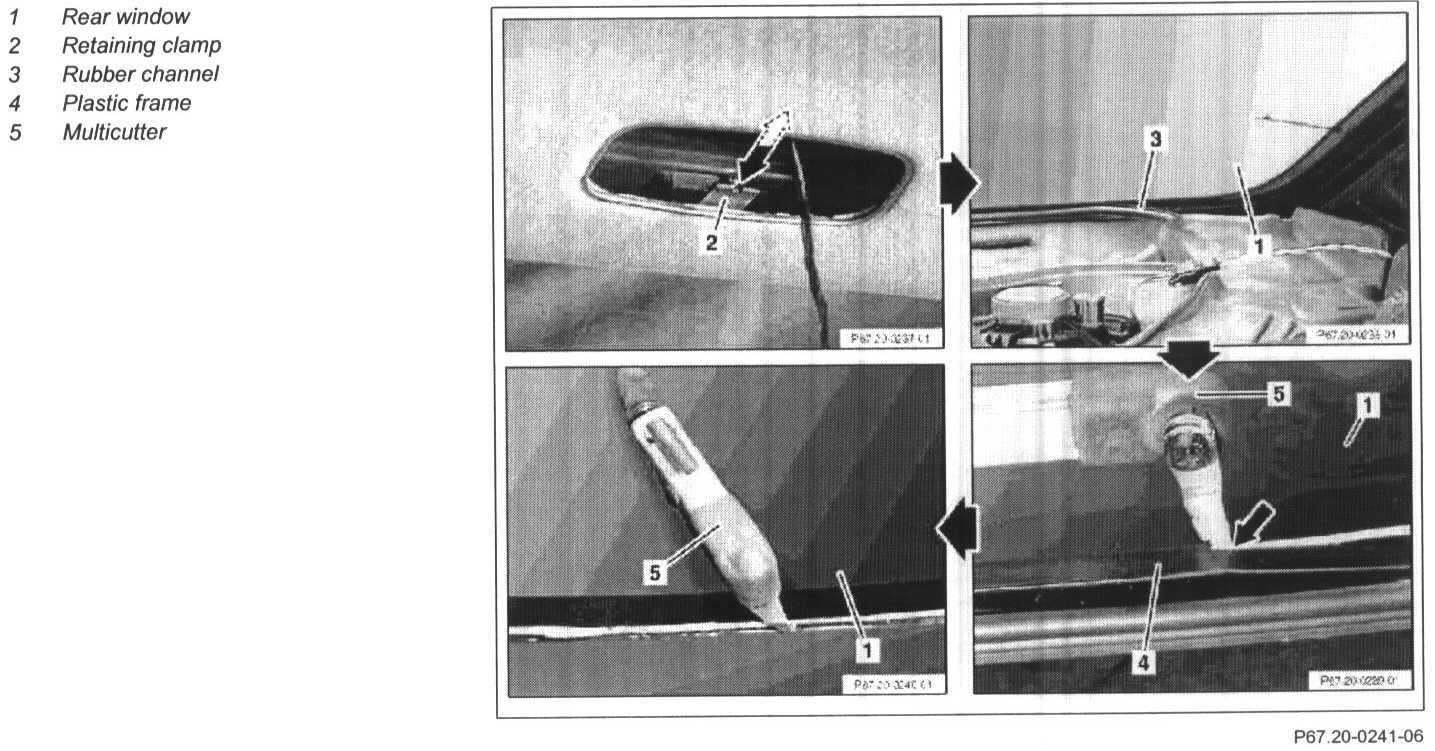 7 Cut off plastic frame (4) at bottom of rear window along edge of glass from outside with cutting blade