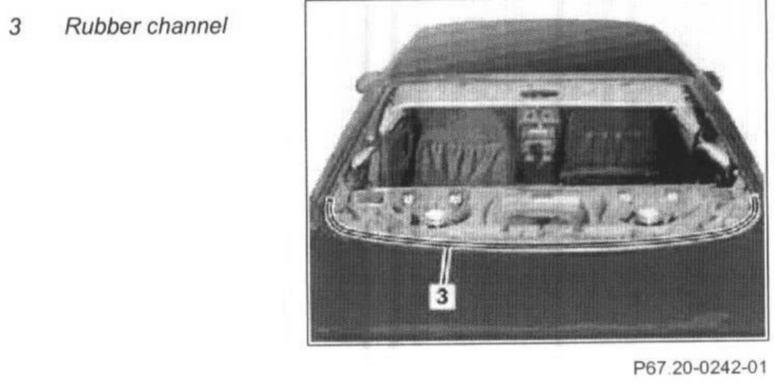 6 Pull rubber channel (3) out of body flange at bottom and remove