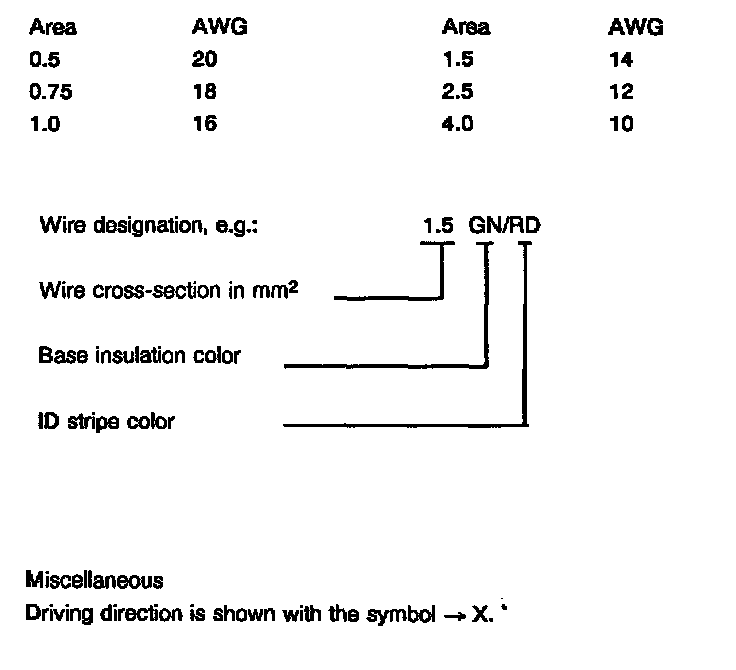 Each wire carries a designation showing its cross-sectional area (in square millimeters) and its color. If a wire must be replaced, always use the same or larger wiring size to prevent overheating. Approximate conversion between cross-sectional area and American Wire Gauge (AWG) is as shown in image.