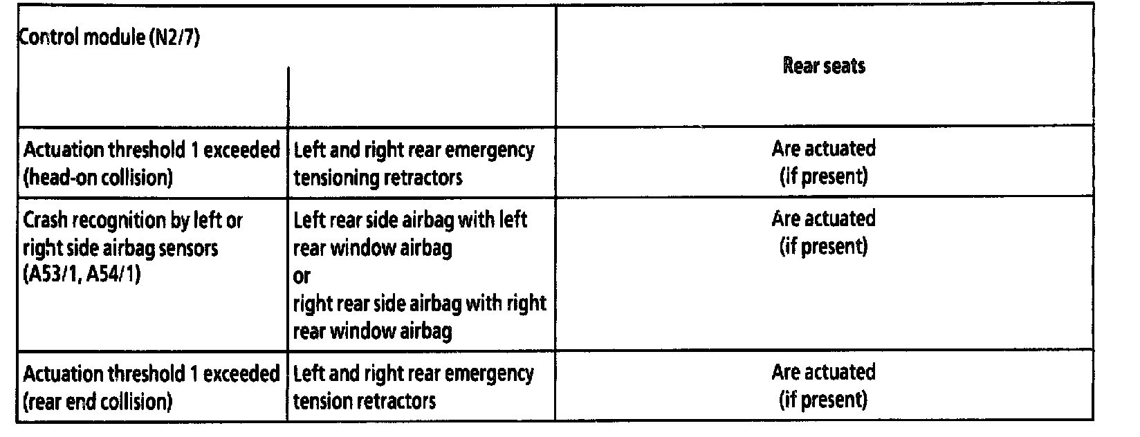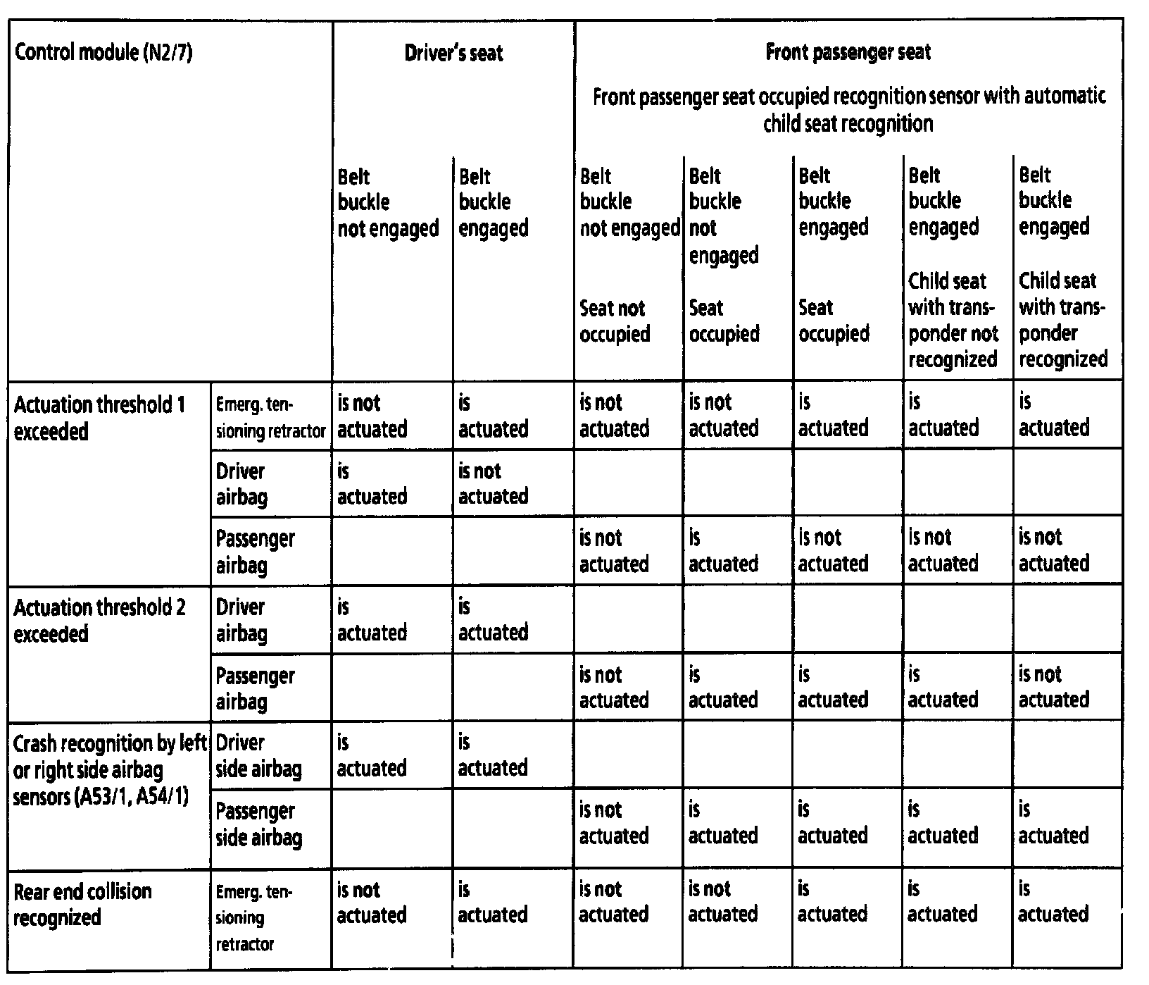 If the belt buckle check is not programmed the driver and passenger airbags are triggered only after exceeding threshold 2.