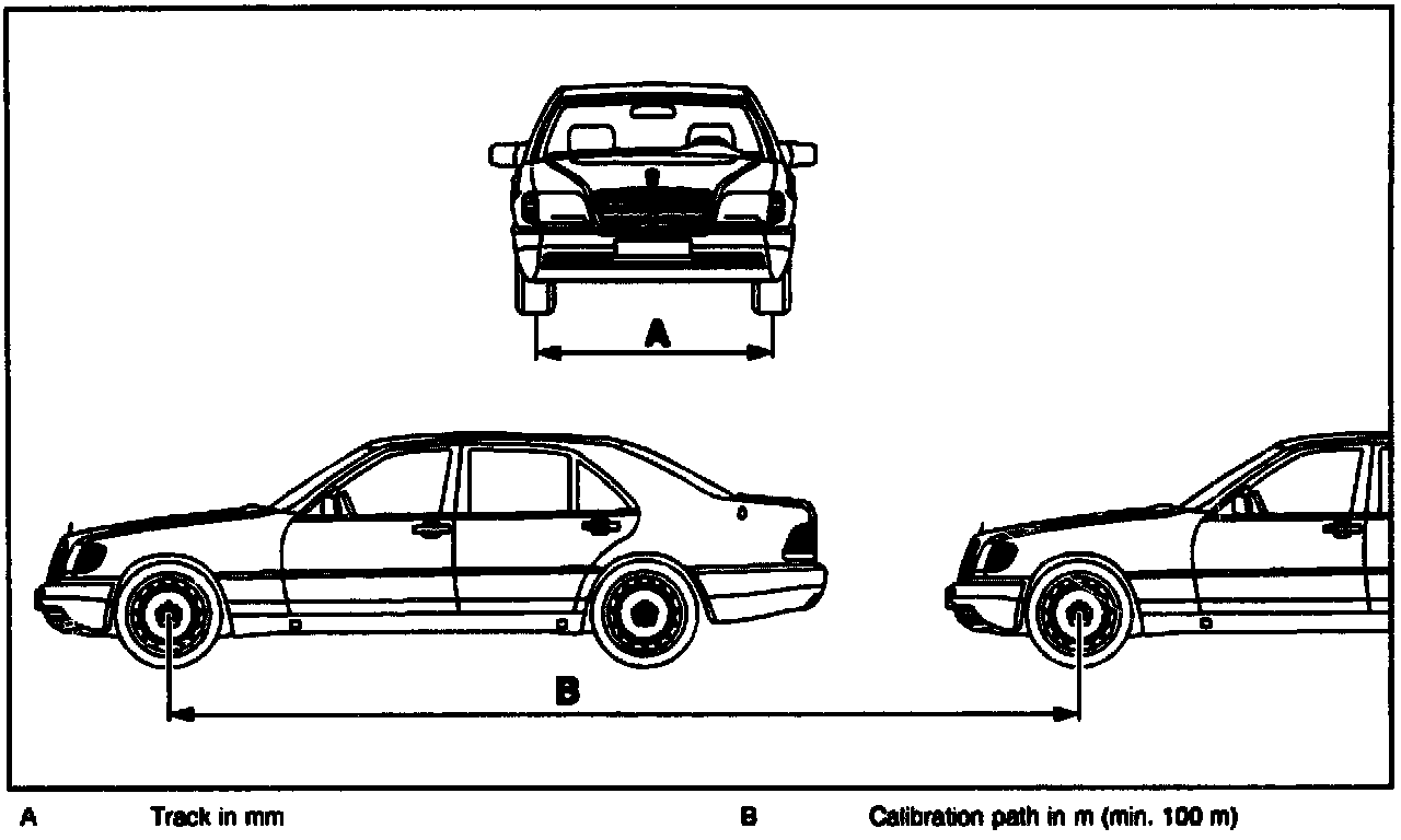 On vehicles with navigation processors (as of 12/96) the test software is stored in the operating unit. The wheel/tire combination can be stored with the aid of the user guided calibration program. For this reason only the displays for starting and entry are mentioned in the steps below.