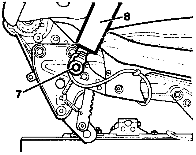 8 Unscrew screw (7) and remove belt buckle (8) from bracket.
