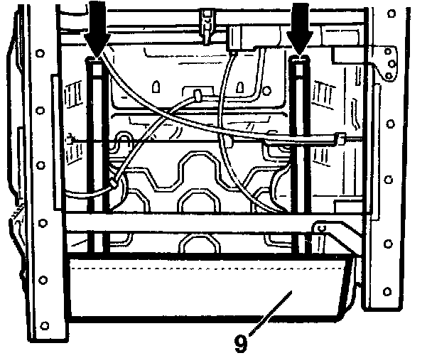 9 Unhook rubber tensioners (arrows) on lower seat cushion frame and expose cloth apron (9).